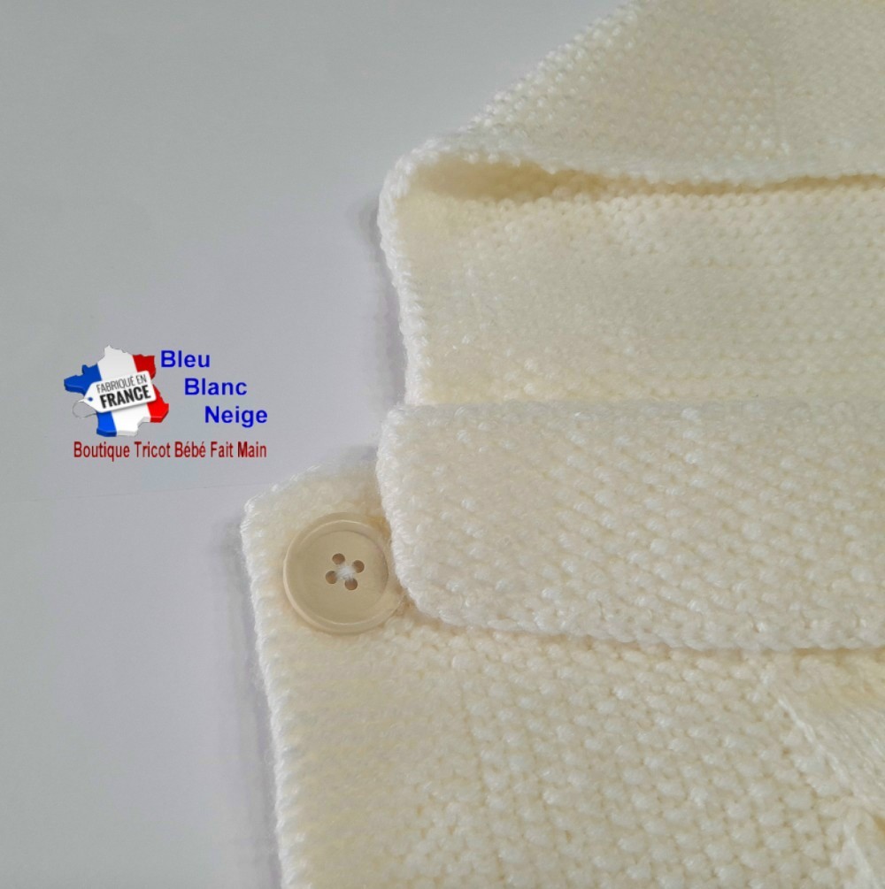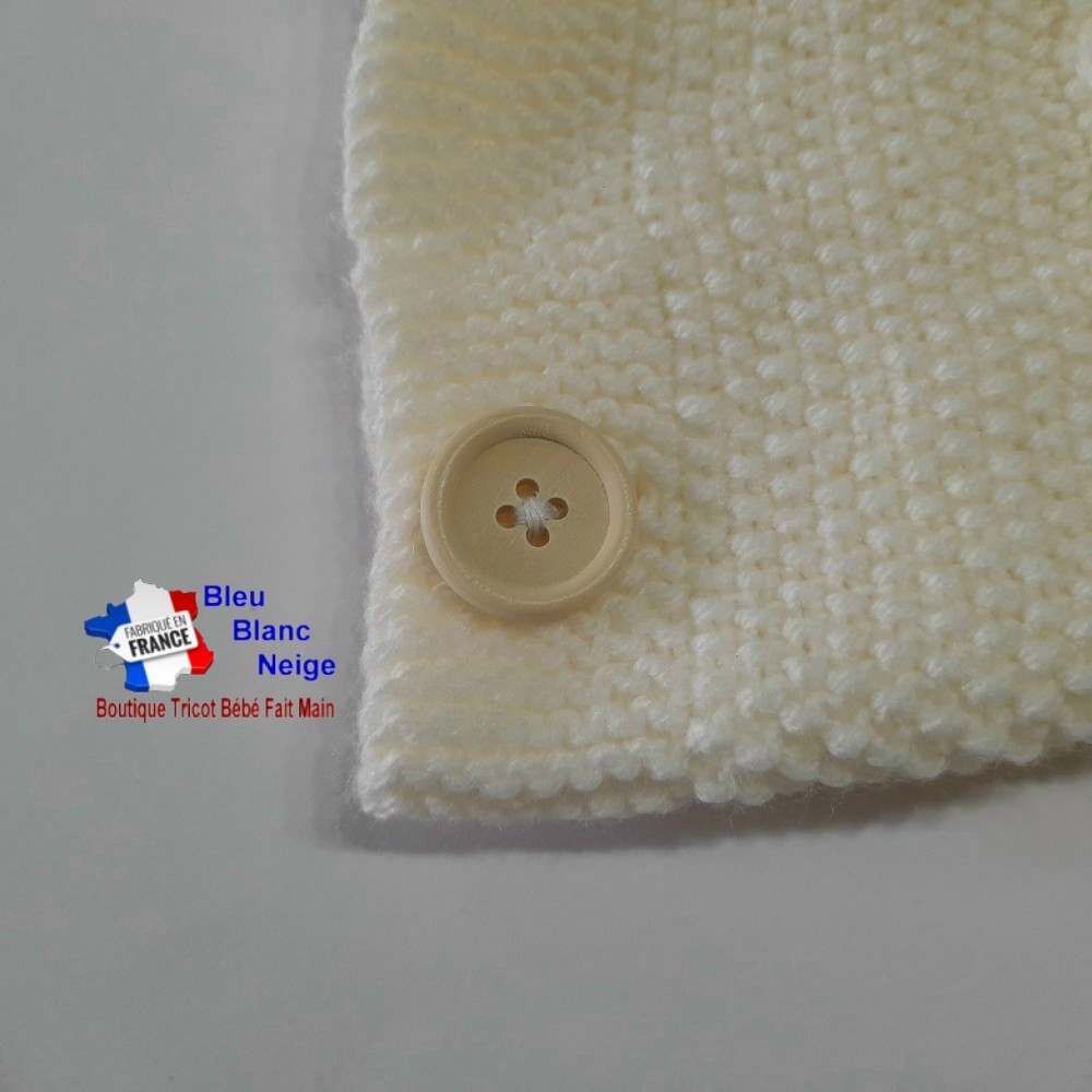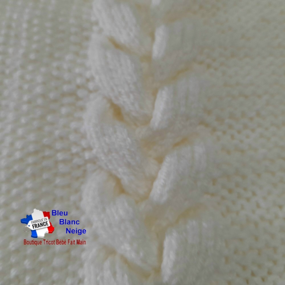 Voici un joli nid d'ange tricoté en laine de taille moyenne aiguilles 4-5, bien chaud, avec des torsades sur le devant. Il a été tricoté également en point mousse et point de riz.. Il n'y a pas de torsades dans le dos pour un meilleur confort pour votre bébé. Le nid d'ange s'ouvre sur les 2 cotés à l'aide de gros boutons coloris beige.