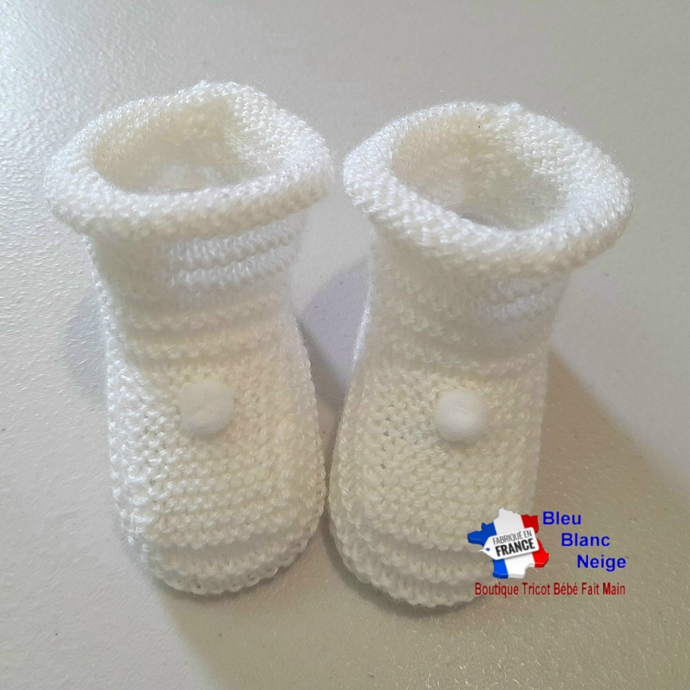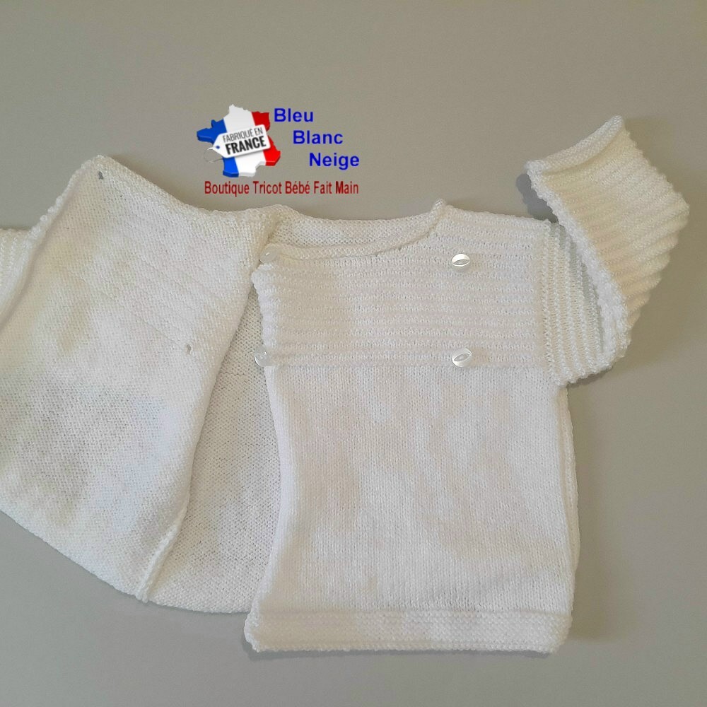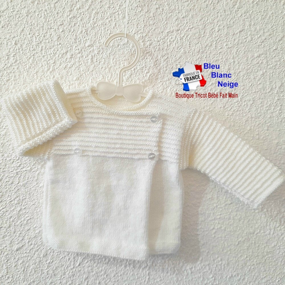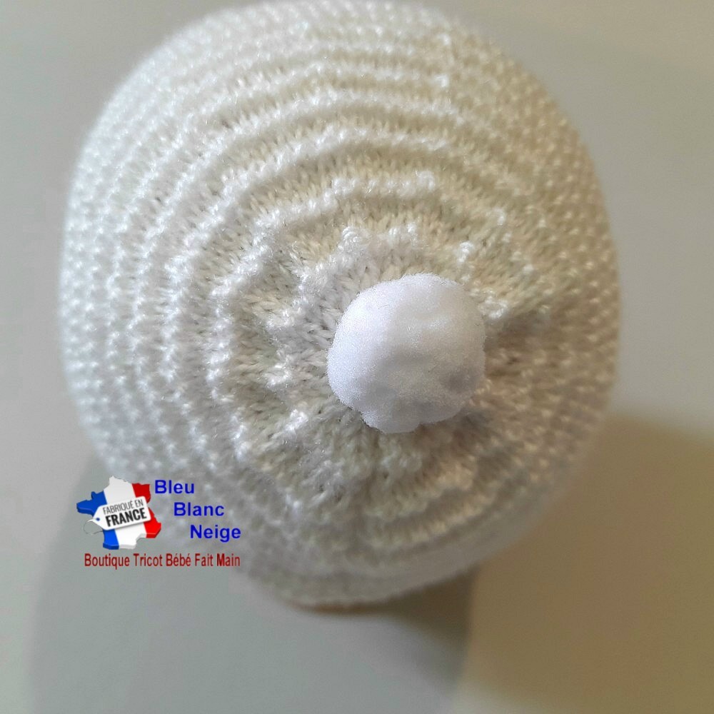 Voici un très joli ensemble pour bébé Fille ou Garçon composé d'un d'une brassière tricotée main en laine fine, et assortie de son bonnet rond et de ses jolis chaussons. Le bonnet et les chaussons sont agrémentés d'un petit pompon blanc, solidement cousu. La brassière se ferme à l'aide de 4 boutons sur le devant. J'ai choisi délibérément le point jersey afin de donner un petit côté 'roulé' sur le bas de la Brassière, du bonnet et le haut des chaussons. Et j'ai utilisé 2 laines de façon à lui donner sensiblement 2 coloris de blanc : sur le corps de la brassière Coloris Blanc, et pour les manches, l'encolure, le bonnet et les chaussons, un coloris un peu plus Ivoire (Coloris Lait). Les points utilisés ainsi que la laine rendent l'ouvrage très souple, extensible et très doux, pour le confort de votre bébé.