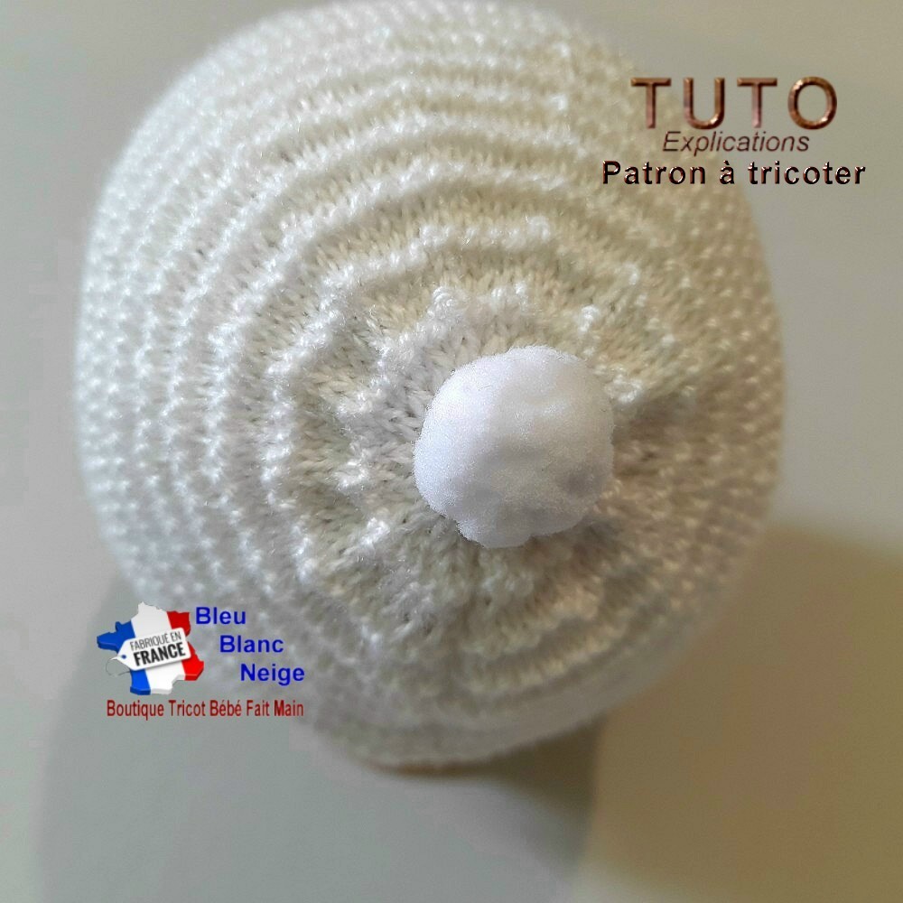 Ensemble tricot bébé MIXTE pour petite fille ou garçon, composé d’une brassière, d'un bonnet rond à rebord 'roulé' et d'une paire de chaussons à rebord 'roulé' sur les chevilles, surmontés d'un petit pompon. Ensemble à réaliser aux aiguilles avec un tuto PDF en français. Idéal pour un cadeau de naissance à tricoter soi-même.