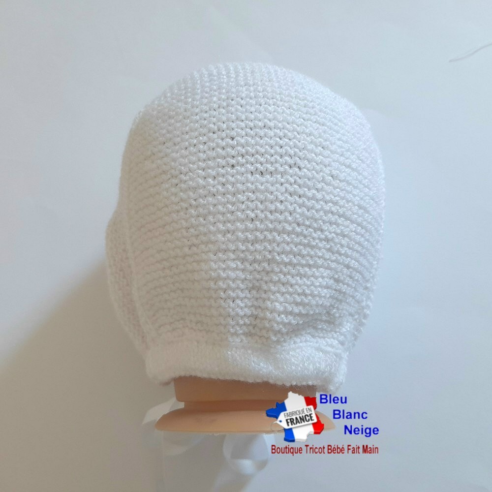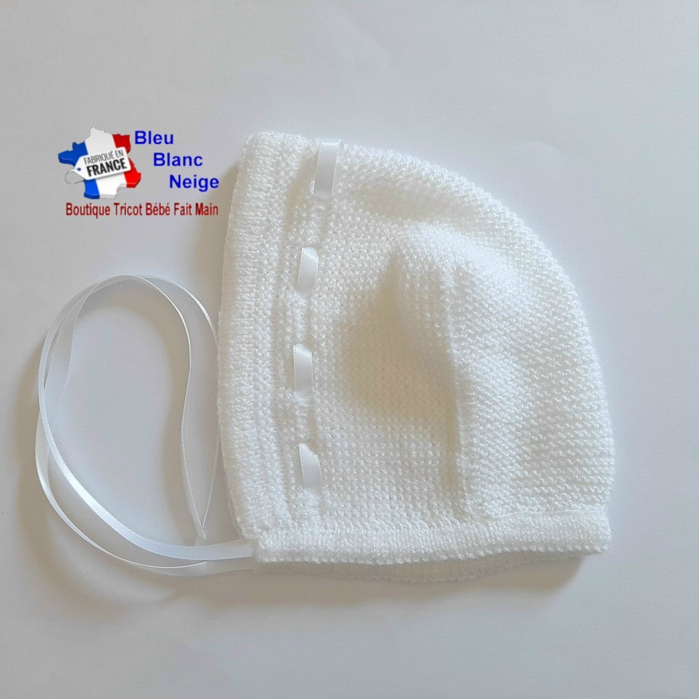 Ensemble tricot bébé fille, composé d’une brassière se fermant dans le dos à l'aide de petits boutons, d'un béguin et d'une paire de chaussons. J'ai agrémenté la brassière d'un joli ruban satin blanc, sur le bas, et d'un petit noeud en satin surmonté d'une petite perle blanche, solidement cousue pour la sécurité de votre bébé. J'ai choisi un point diagonale et des jours. Le béguin ainsi que les chaussons se resserrent avec également un ruban satin.Les points utilisés ainsi que la laine rendent l'ouvrage très souple, extensible et très doux, pour le confort de votre bébé.