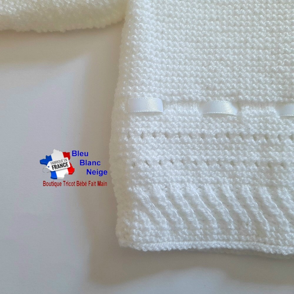 Ensemble tricot bébé fille, composé d’une brassière se fermant dans le dos à l'aide de petits boutons, d'un béguin et d'une paire de chaussons. J'ai agrémenté la brassière d'un joli ruban satin blanc, sur le bas, et d'un petit noeud en satin surmonté d'une petite perle blanche, solidement cousue pour la sécurité de votre bébé. J'ai choisi un point diagonale et des jours. Le béguin ainsi que les chaussons se resserrent avec également un ruban satin.Les points utilisés ainsi que la laine rendent l'ouvrage très souple, extensible et très doux, pour le confort de votre bébé.